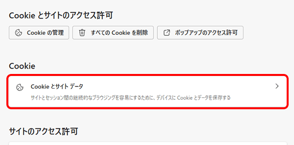 - 画面右側に表示される[Cookie]下の[Cookie とサイト データ]をクリックします。