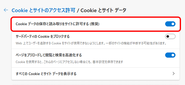 [Cookie データの保存と読み取りをサイトに許可する(推奨)]を[