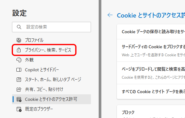 - 画面左側の[プライバシー、検索、サービス]をクリックします。
