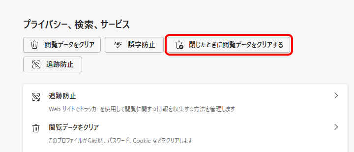 - 画面右側に表示される[プライバシー、検索、サービス]下の[閉じたときに閲覧データをクリアする]をクリックします。