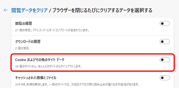 - [ブラウザーを閉じるたびにクリアするデータを選択する]画面が表示されます。